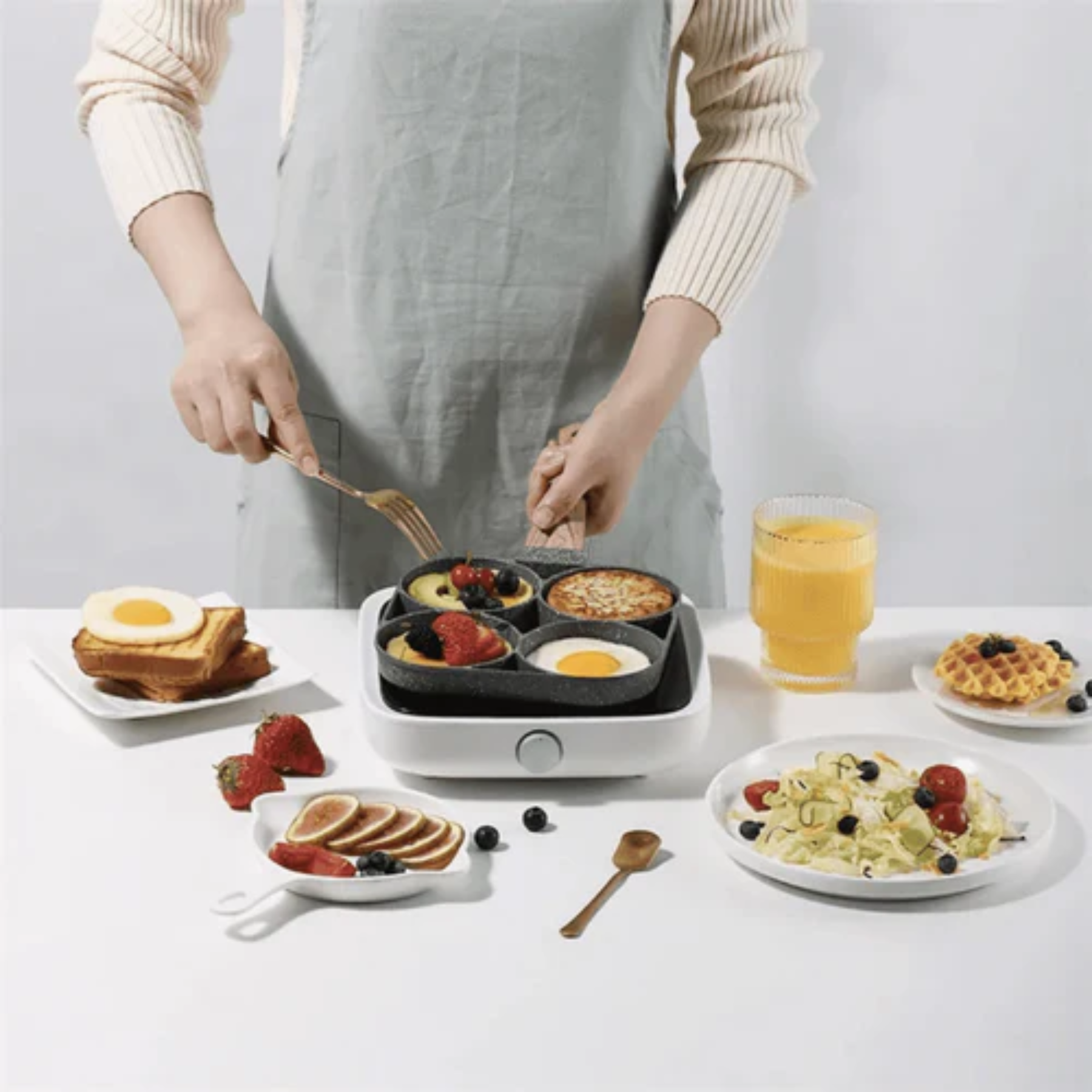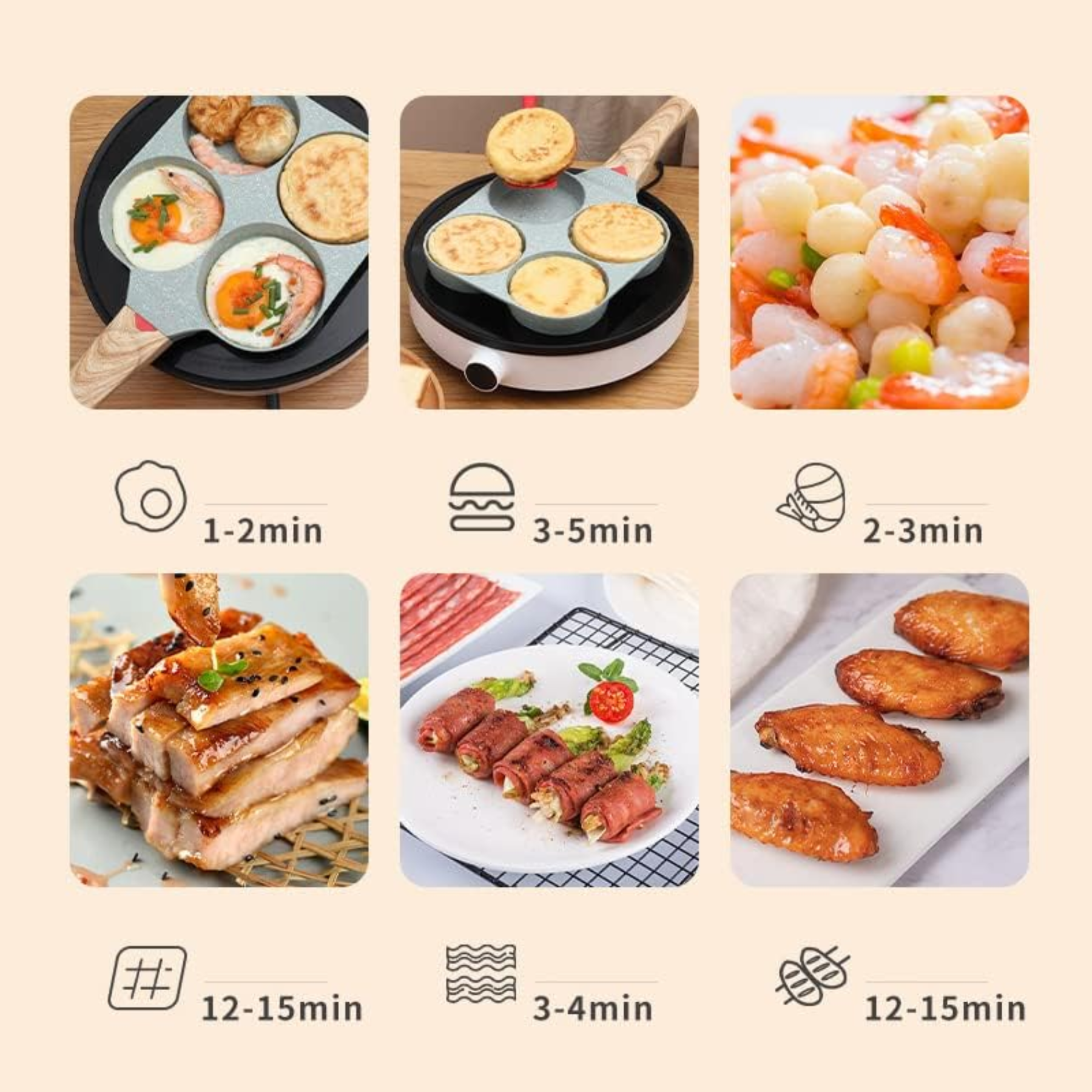 Versatilidad Culinaria 🍽️: No solo es ideal para huevos y mini panqueques, sino que también puedes utilizarla para cocinar otros alimentos como tortillas, hash browns, mini pizzas o incluso verduras.