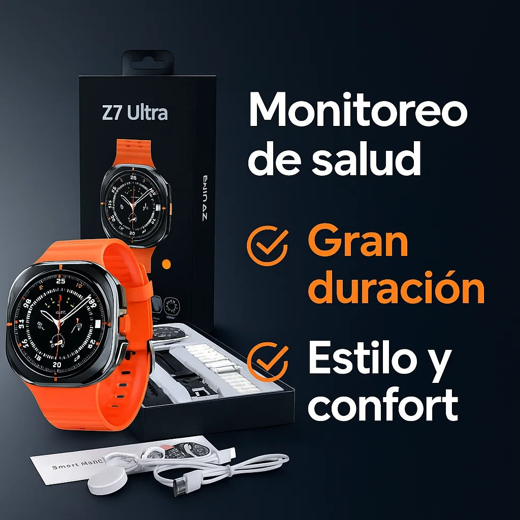 El Z7 Ultra no es solo un reloj, es un aliado en tu día a día. Su diseño moderno y resistente lo hace perfecto para entrenar, explorar o simplemente acompañarte en la rutina. Con su pantalla HD de 1,46” disfrutarás de imágenes nítidas, mientras que su batería de larga duración (hasta 7 días) te asegura energía para seguir tu ritmo sin interrupciones.